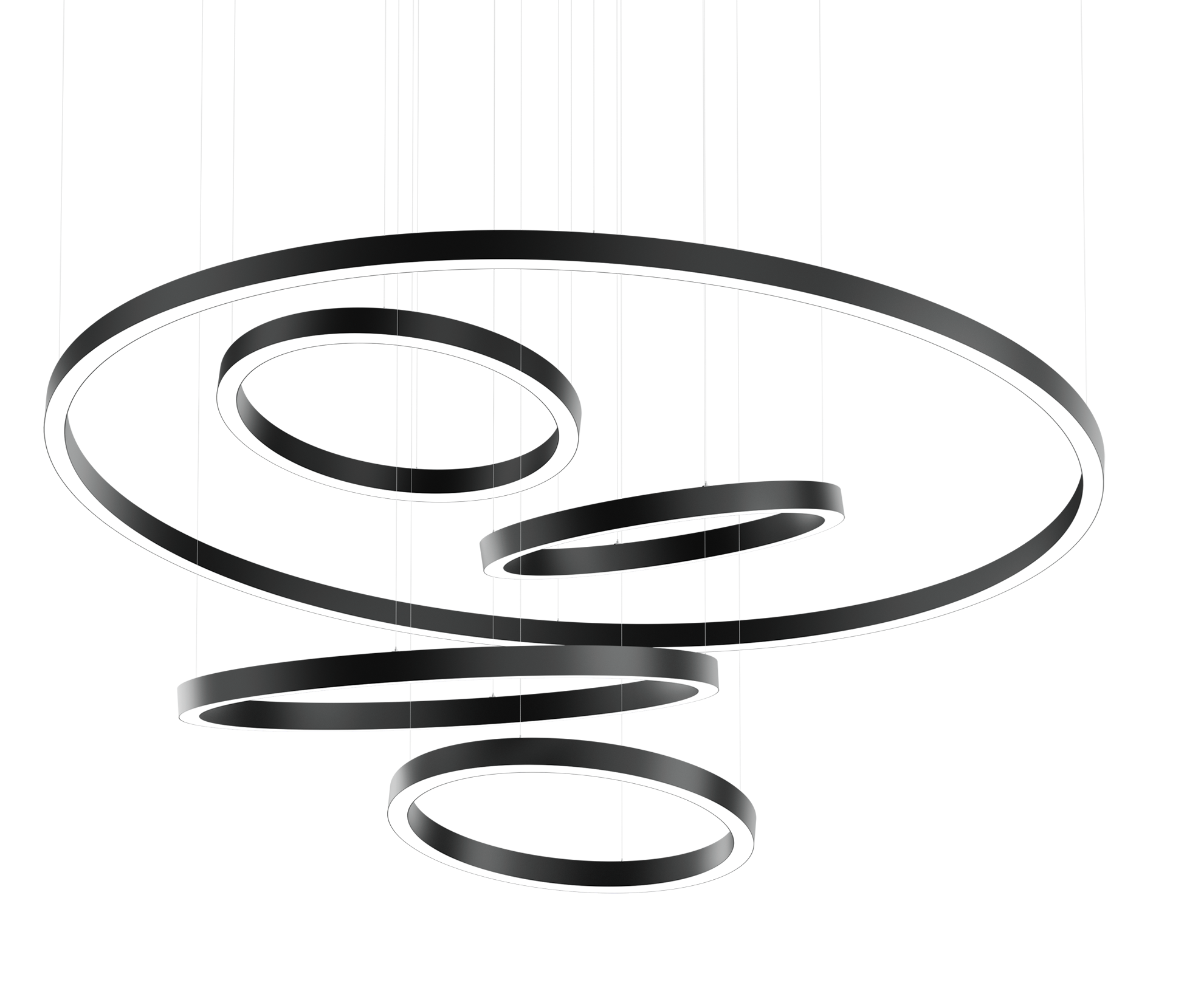 Flexible aircraft cable suspension, 78" long. Luminaire height can be adjusted without tools. The suspension cables attach to the luminaire via spring clips and can be positioned freely.