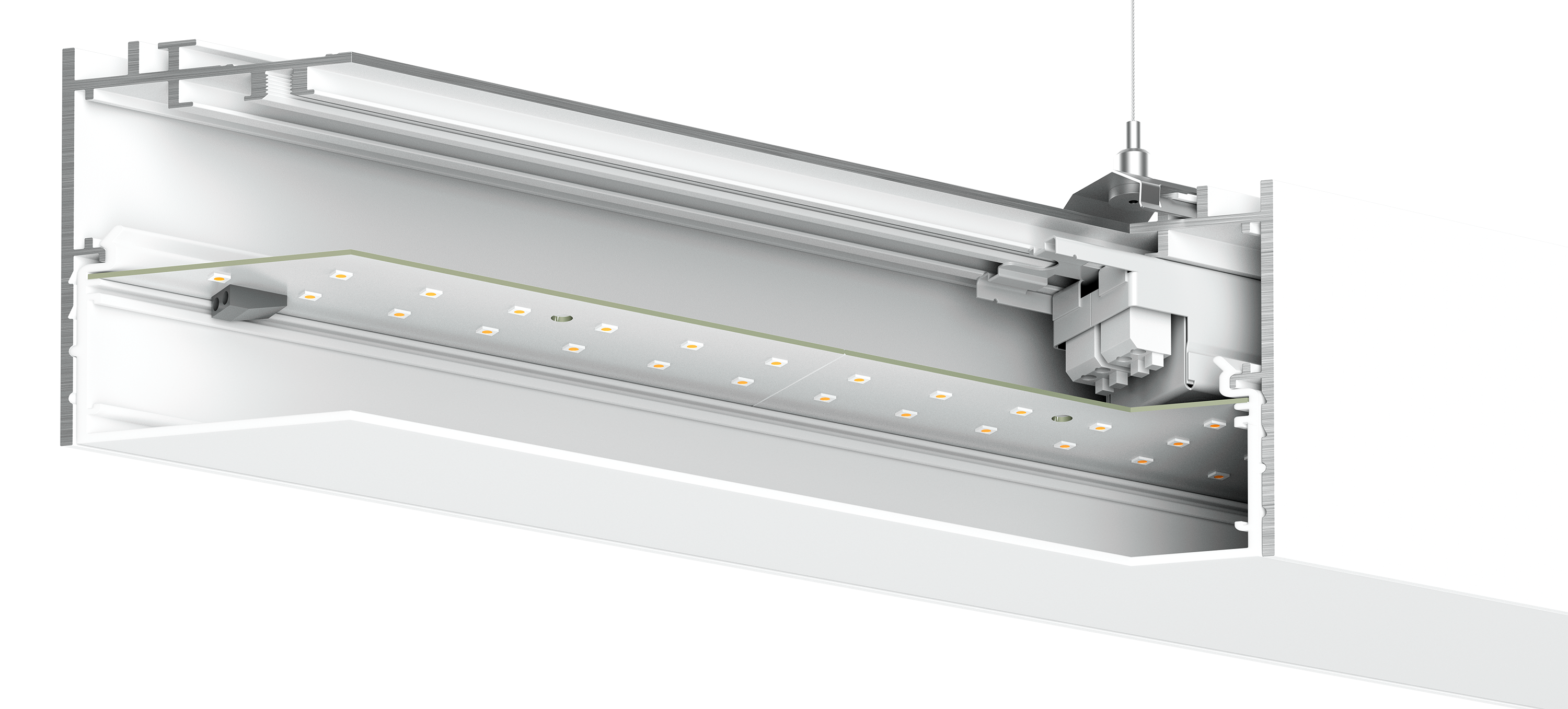 Additionally, there are options for direct-indirect functionality. Available in three colors with a matte finish. Snap-in LED boards and covers with light leak free gasket endcaps.