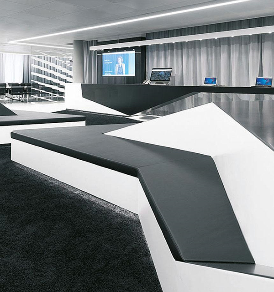 Search Excerpt: The name Microsoft has always stood for communication. The lighting concept is markedly subdued. BASO is installed throughout the Briefing Center in a sharply geometrical fashion. They complement the room’s dynamic, provide for a consistently calm atmosphere and additionally help guide foot traffic.