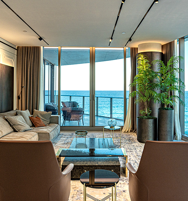 This high-end resident suite observing the bright beaches of Sunny Isles, Florida mixes the earth tones and warmth of home with the marble interiors and luxury of...