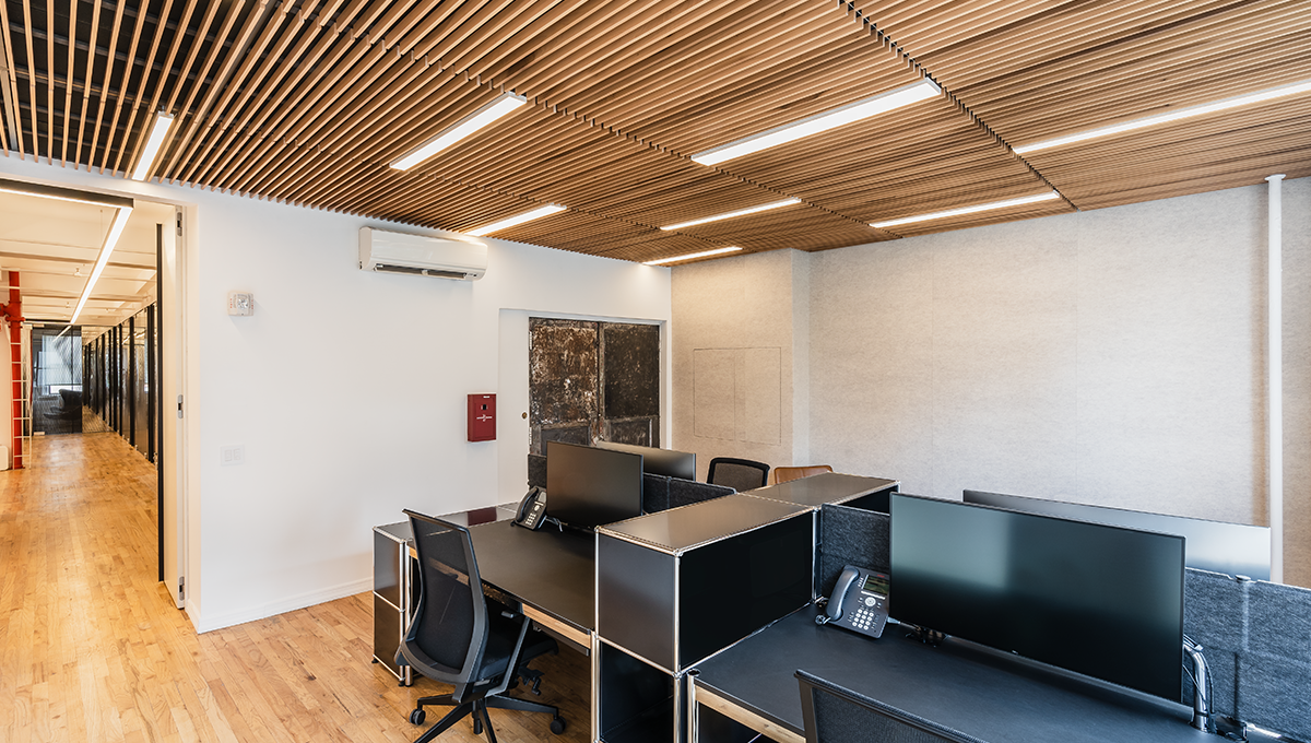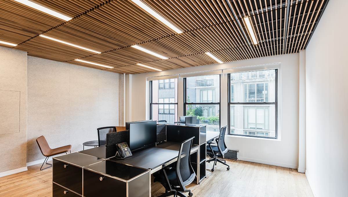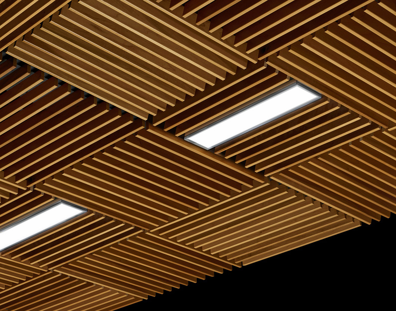 Additionally, the wooden framing provides both sound-reduction and insulation for cool and warm climates. Harmonize your rooms by hiding away minor ceiling imperfections or wiring for a cleaner presentation. Armstrong® WoodWorks® combined with the PANO linear light fixtures make installation easy.