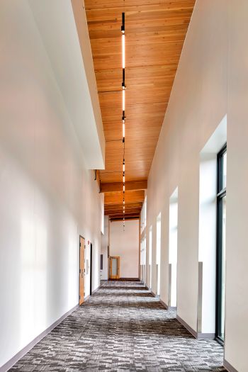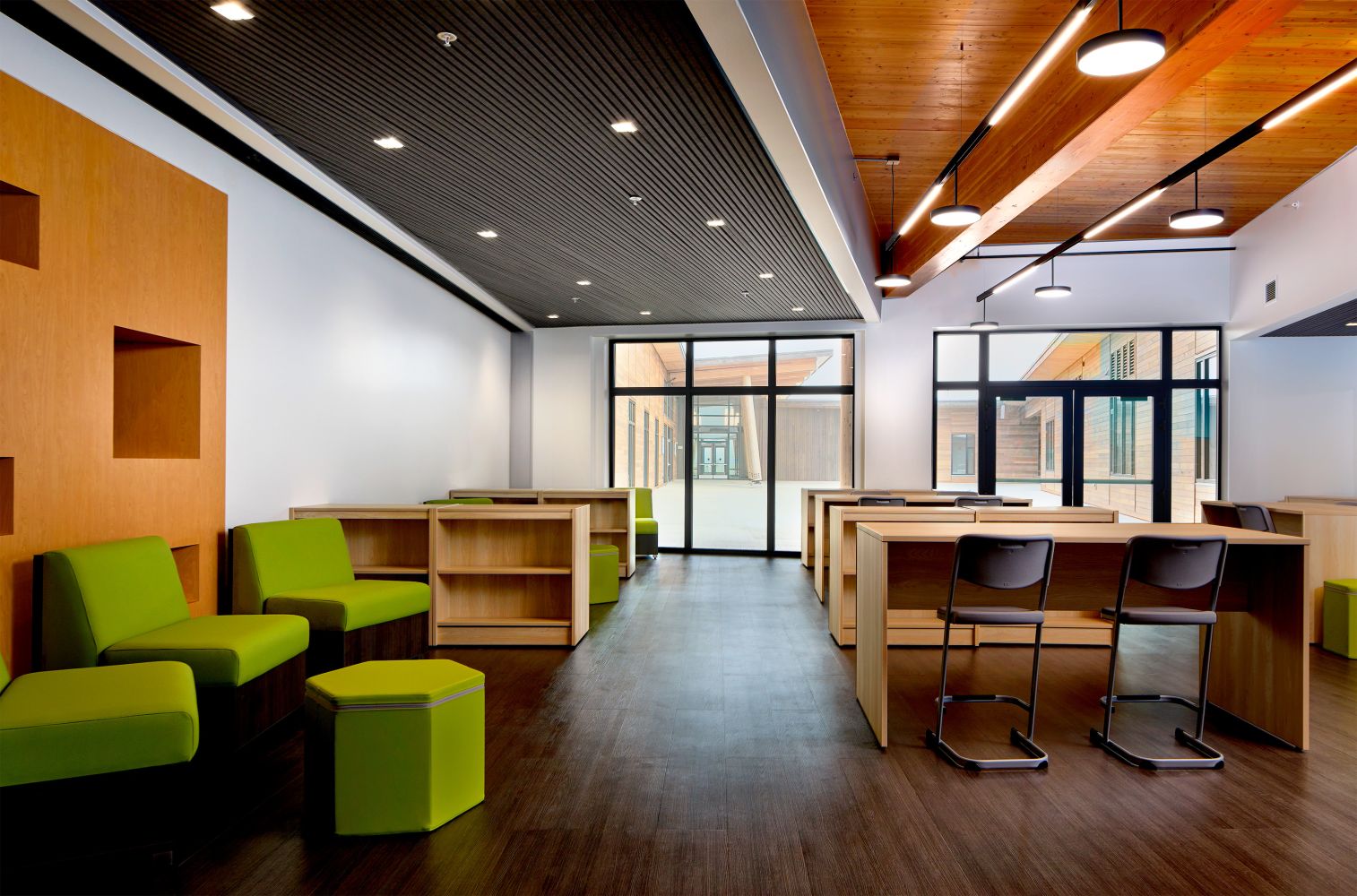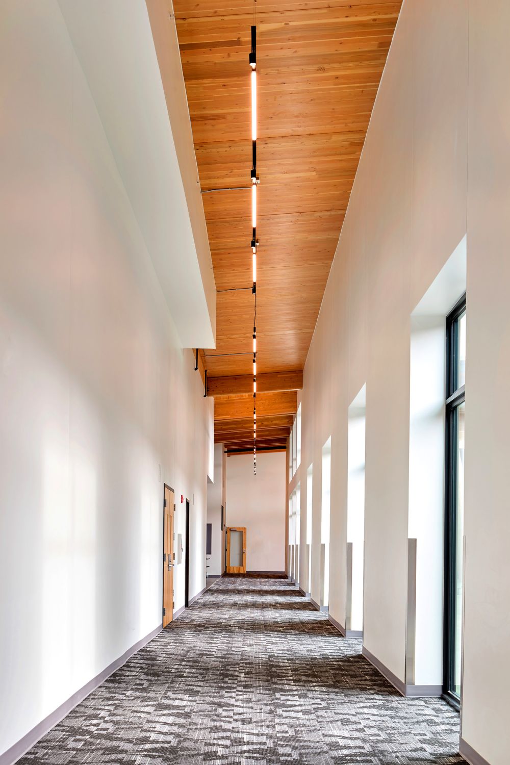 This room is illuminated through two products working in concert. It uses the M-LINE system, combining spot lights with linear insets. The ROUND inset of the M-LINE track system compliment the warm, acoustic environment of the the Quileute Tribal School, providing the room with an organic rhythm.