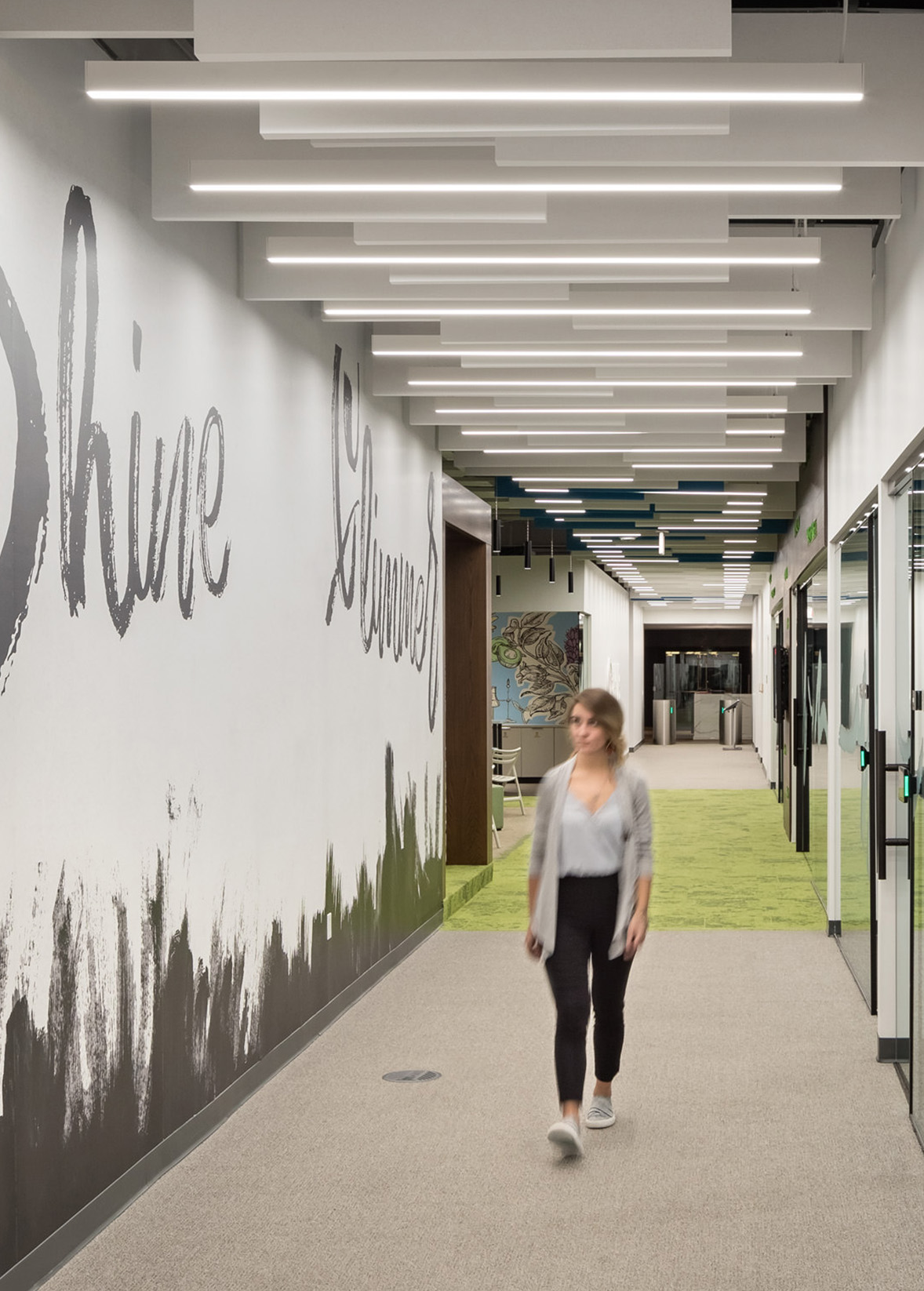 Exuding an organic interior, this warm L'Oreal office space was finished a row of BASO lighting fixture extending down the hallway. This gives the space a pleasant rhythm and illuminates the bold mural on the left wall.