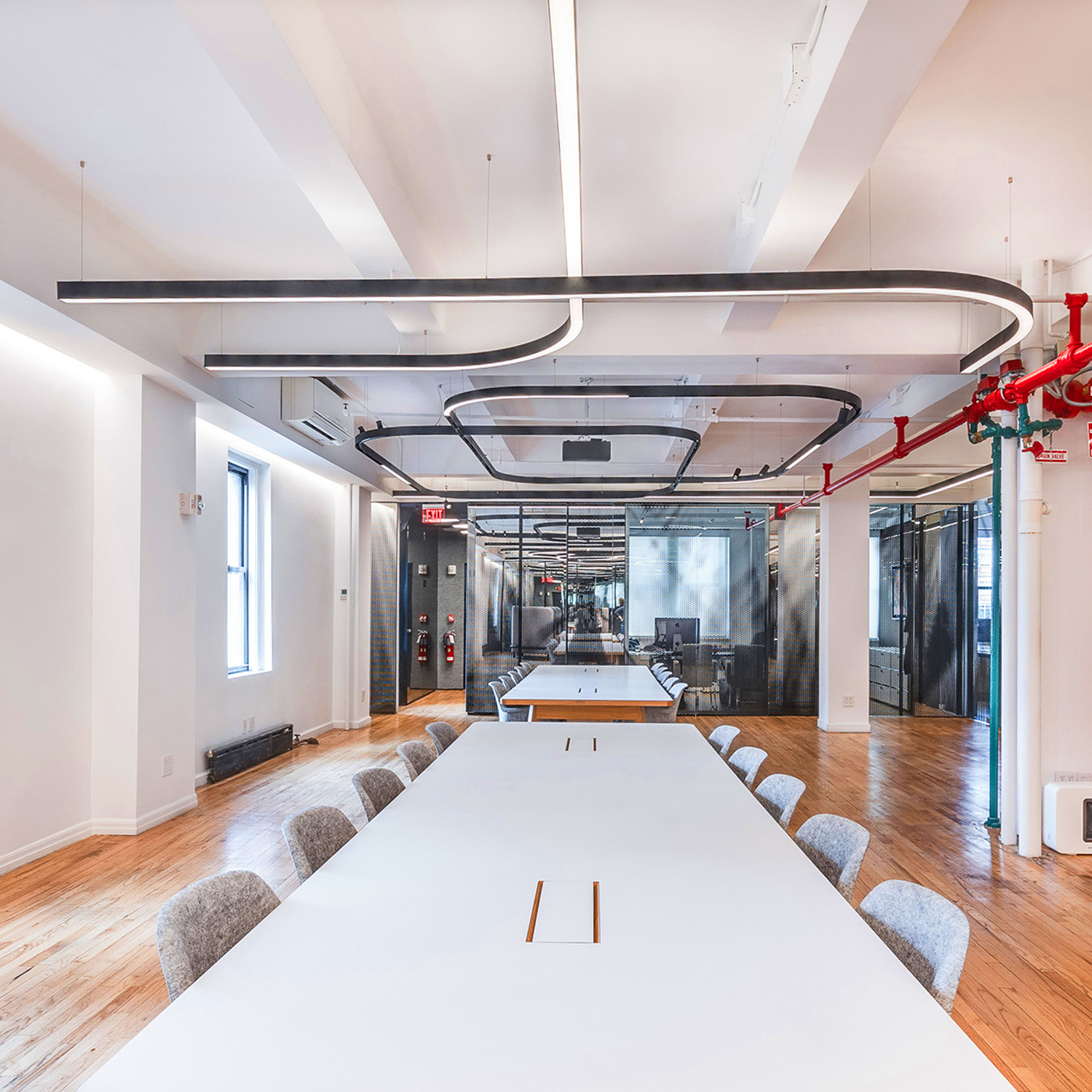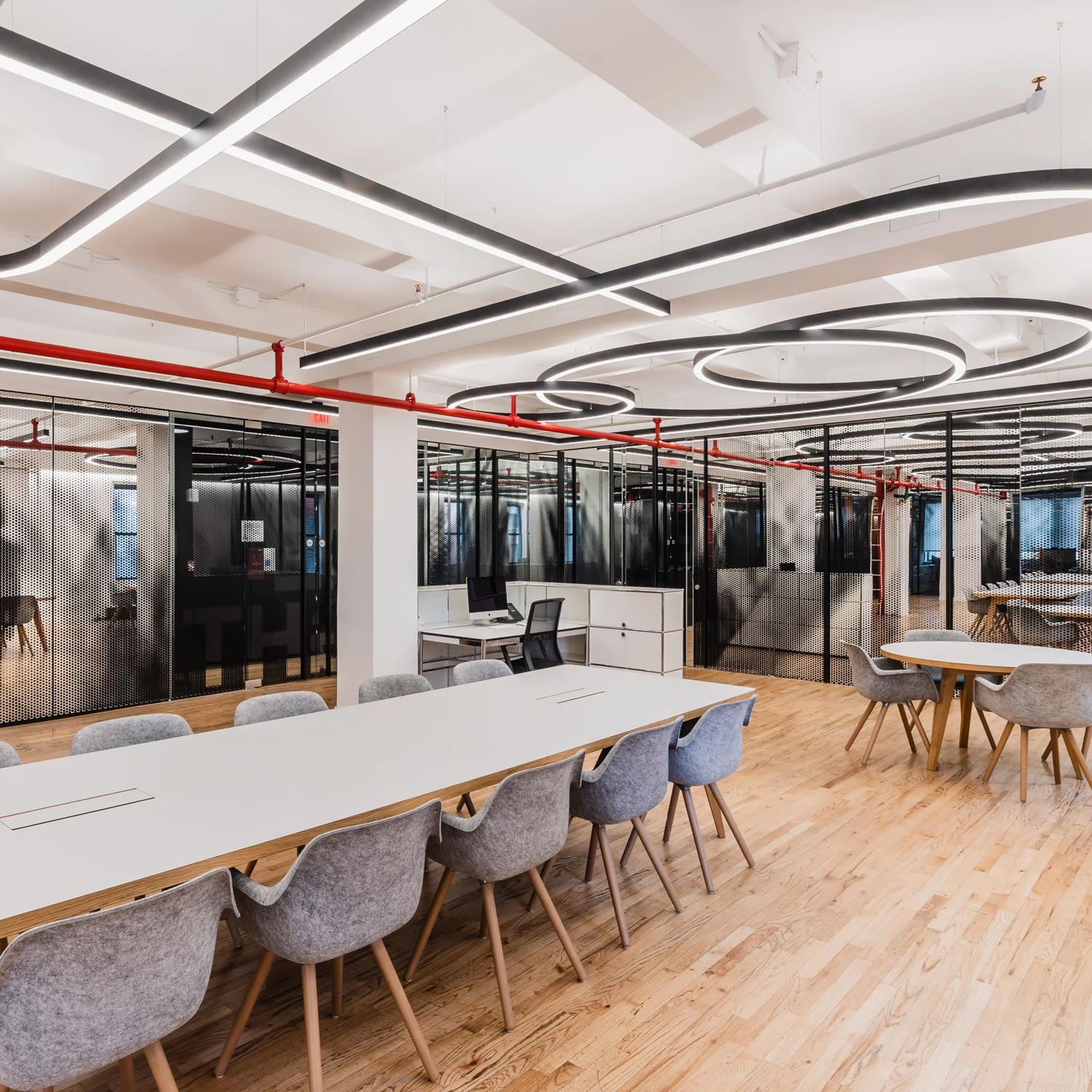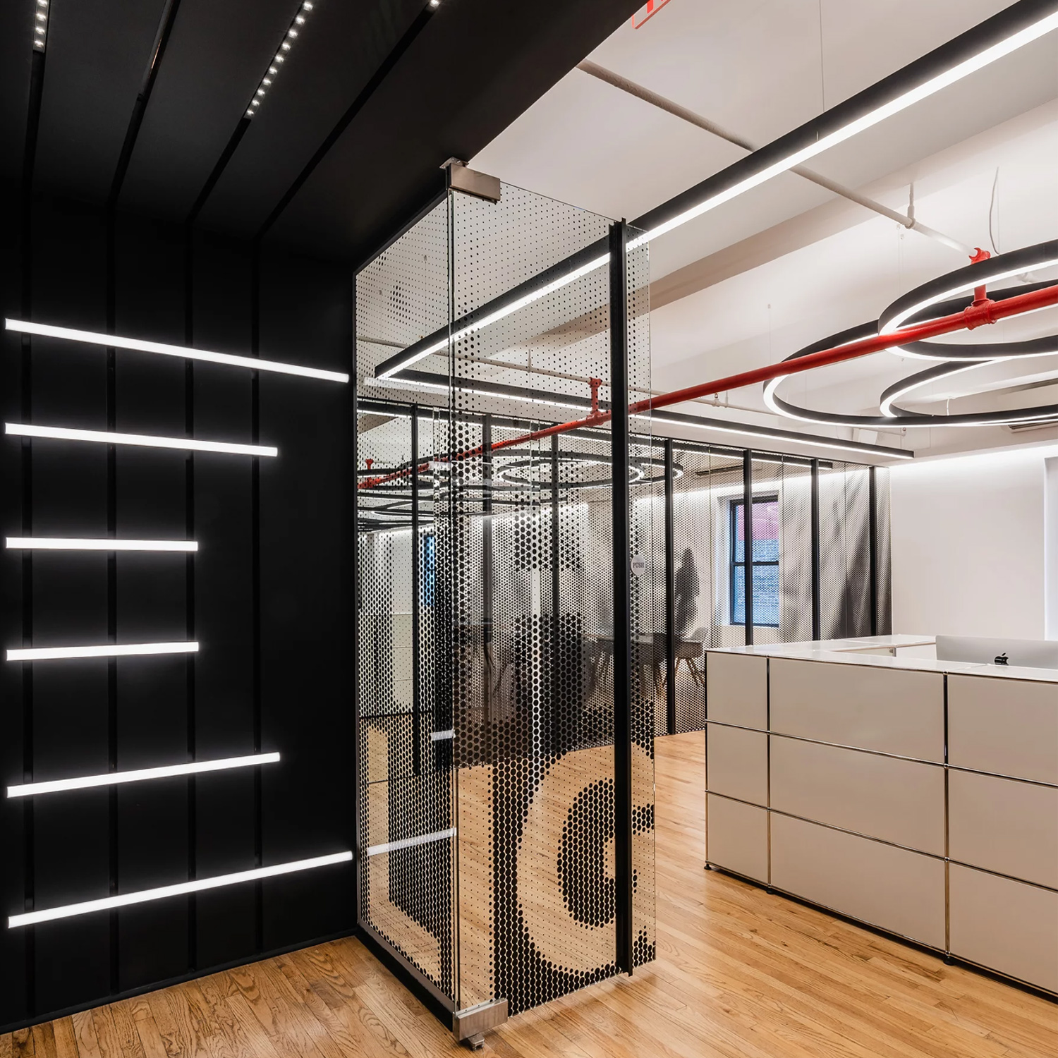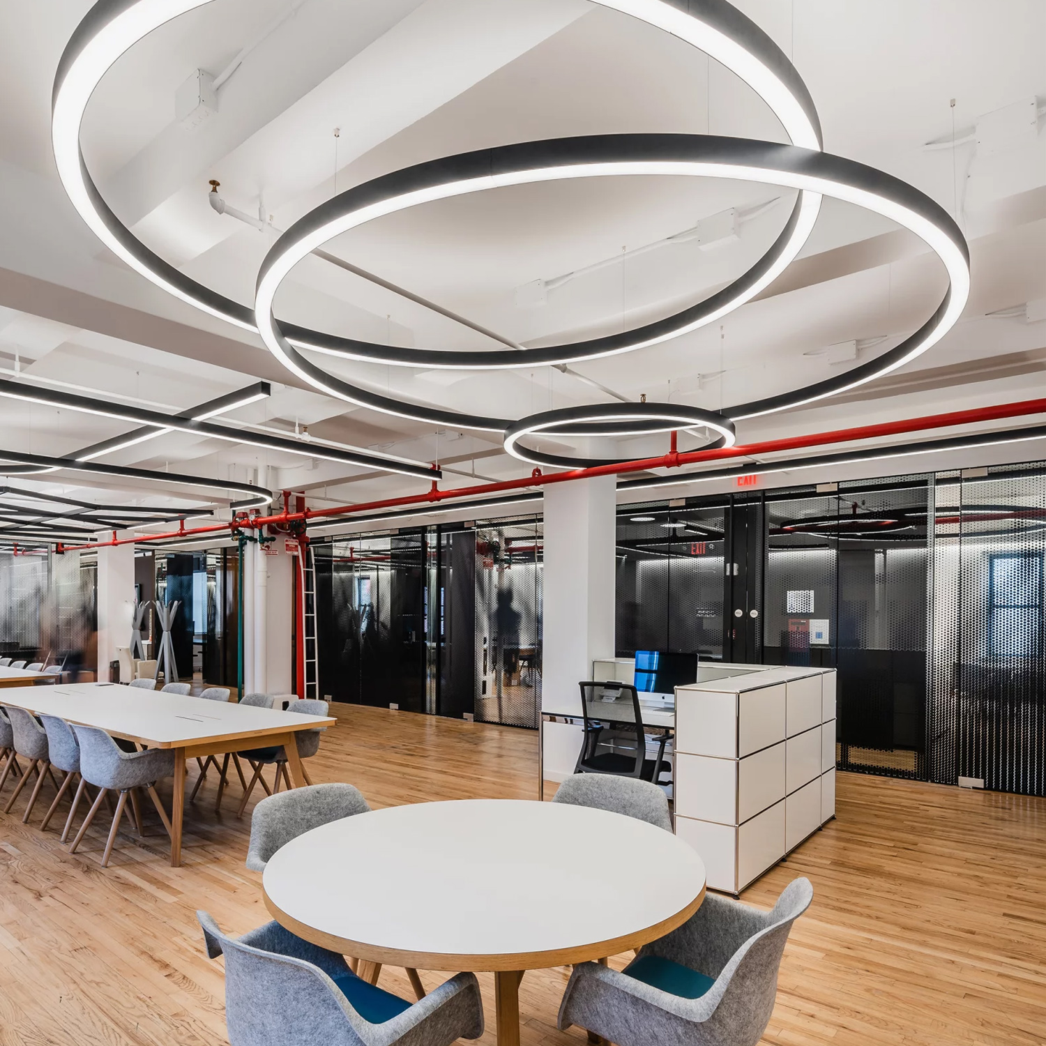 Our New York City Showroom is the ideal space for capturing a high-end business casual environment. The elevator lobby greets with a delicate arrangement of LOUVER and TUBE against a matte finish. The room then becomes a professional open space adorned with R-LINE, CIRCLE, BASO and CURVE luminaries, creating a room perfect for meetings, conferences and events.