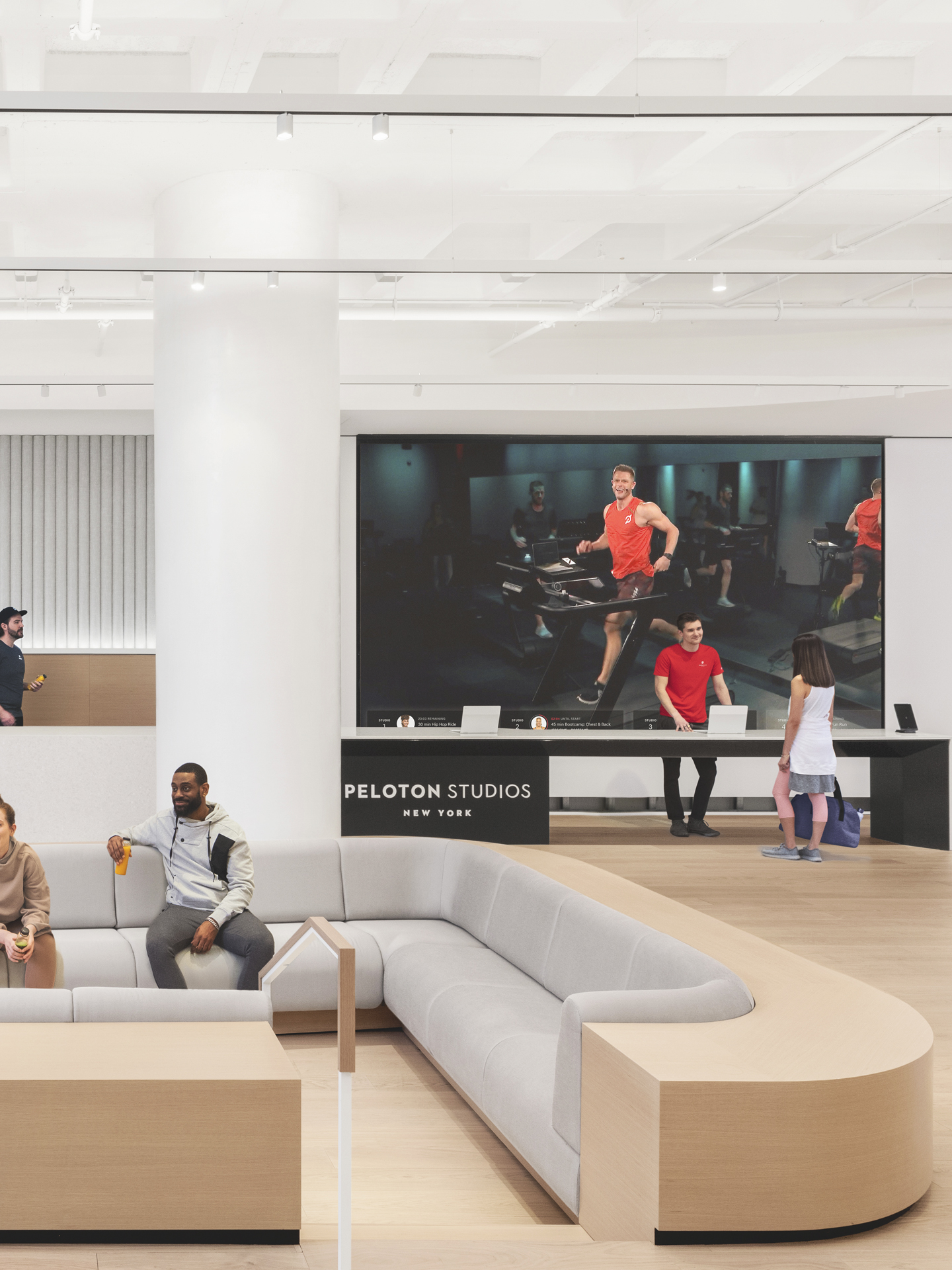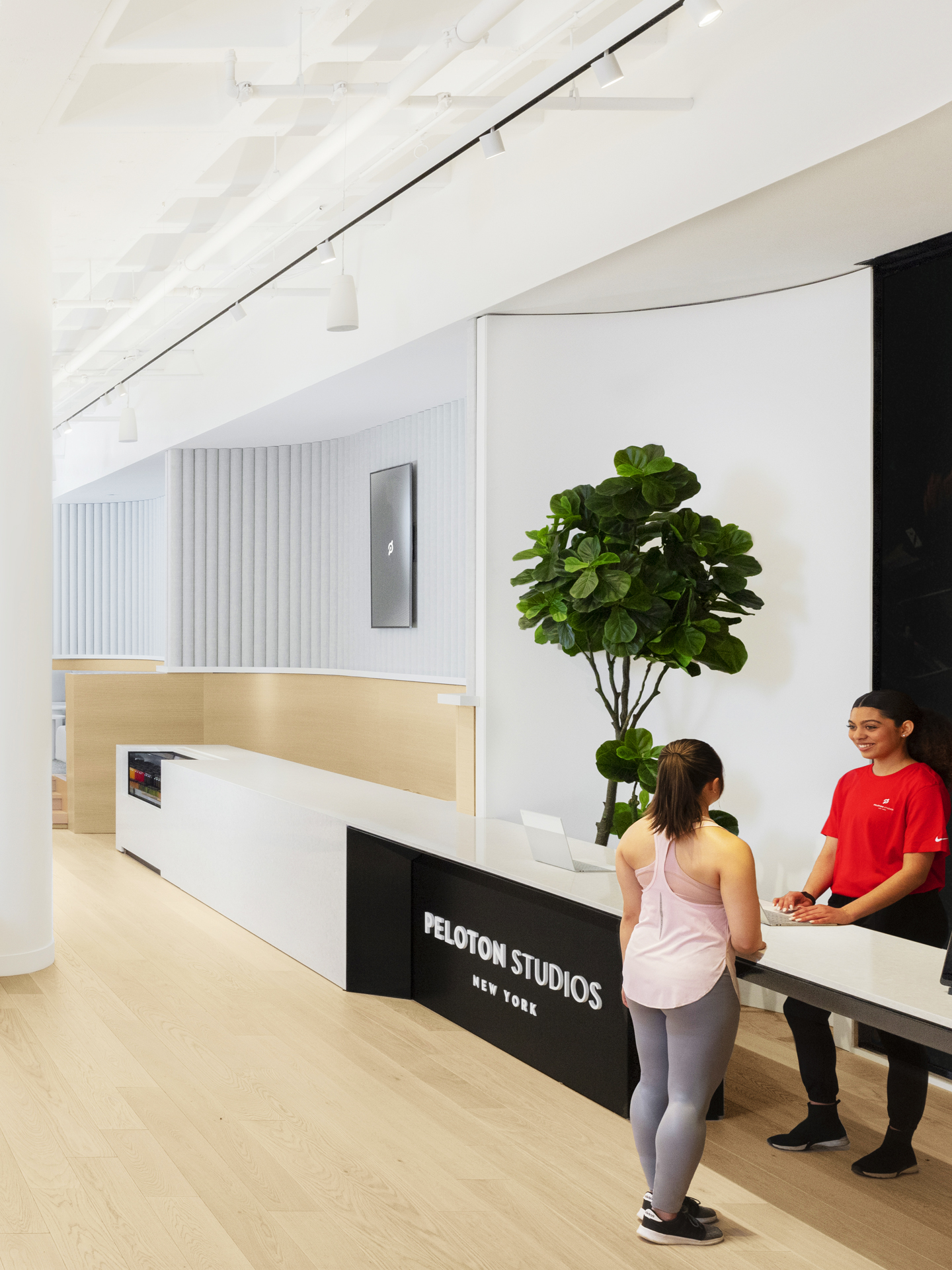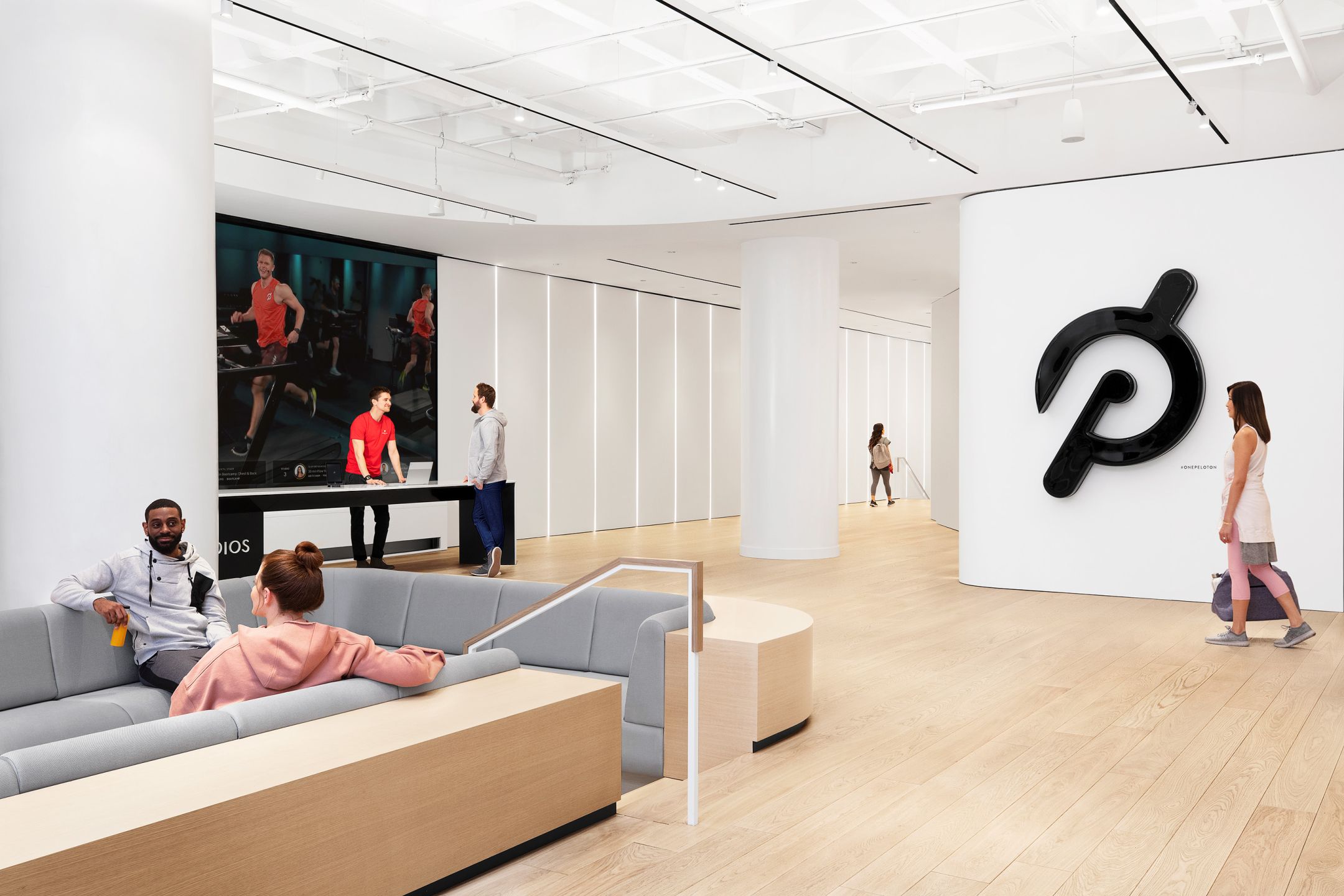 Located in Hudson Yards, the Peloton Flagship Studio is where grit and hard work meets technology and innovation. The bright setting contrasted by the bold logo and large video displays. M-LINE is applied carefully here to continue the overall design language of the interior as white track lights span across the main lobby.