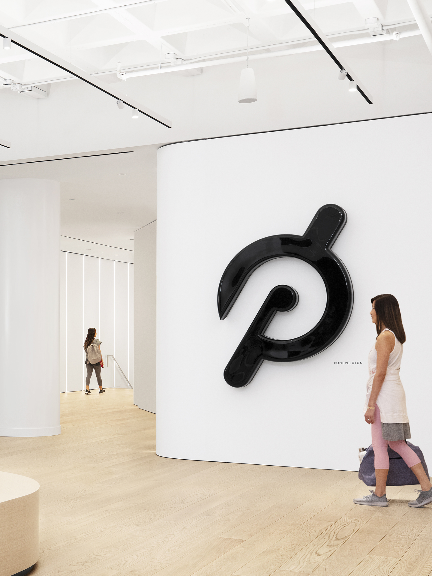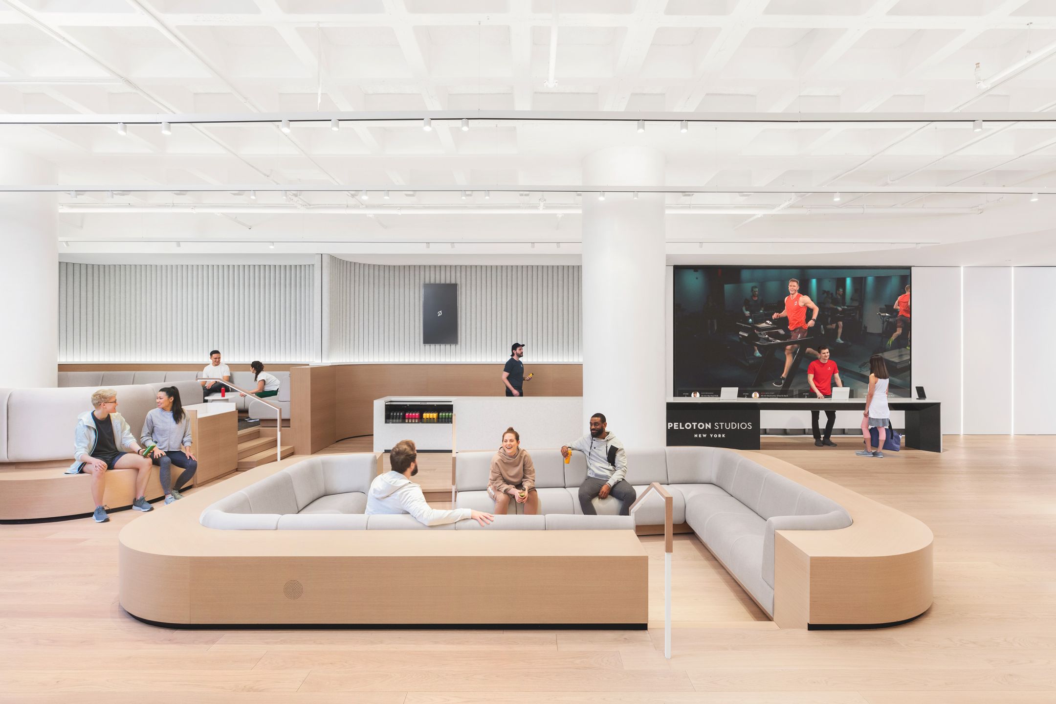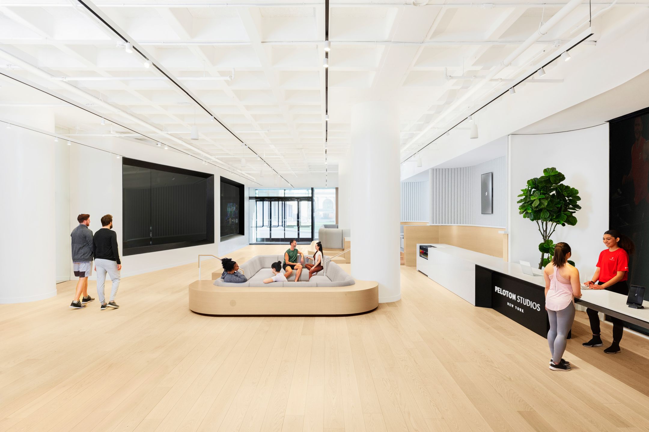 Located in Hudson Yards, the Peloton Flagship Studio is where grit and hard work meets technology and innovation. The bright setting contrasted by the bold logo and large video displays. M-LINE is applied carefully here to continue the overall design language of the interior as white track lights span across the main lobby.