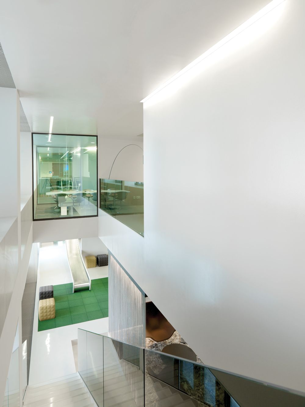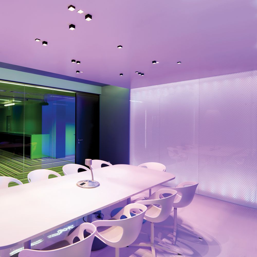 FLEX-LITE, PERIMETER, ROUND were implemented in this lounge and office space for Microsoft’s location in Graz, Austria. The simple, square surface and recessed lights inform the unique geometry of the interior. While ROUND offers playful, round surface lights that help build the overall design language. Patterned glass walls and organic furniture bring the space together with the bold use of shapes throughout.