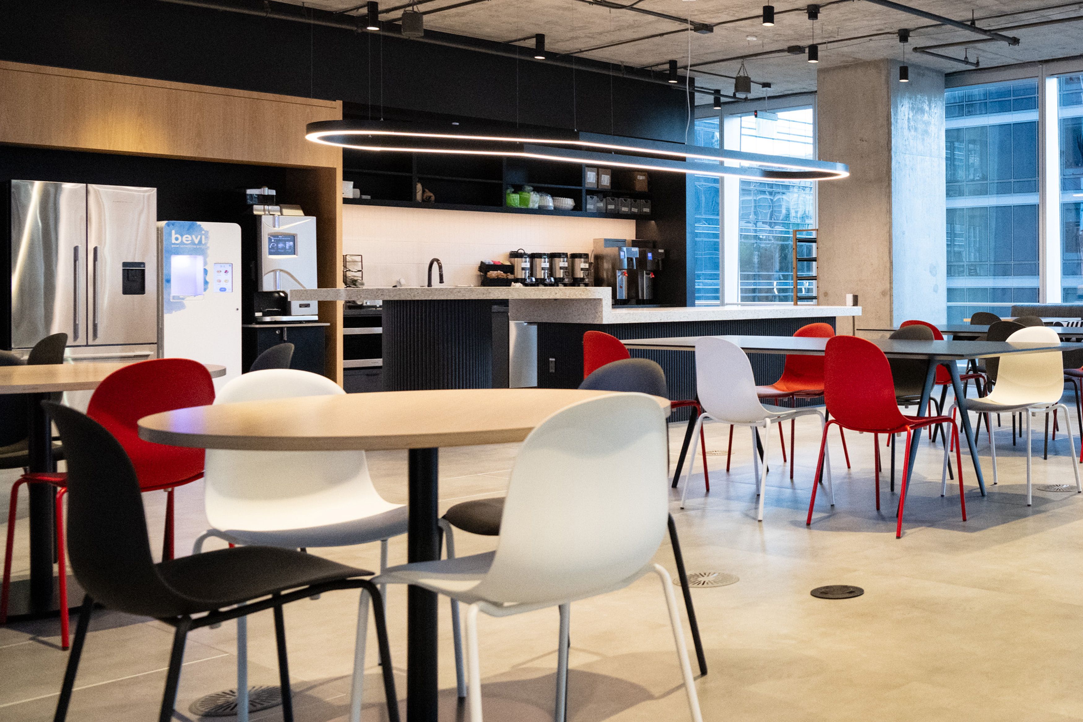 Our pendant luminaire ROUND matches the interior perfectly, lining the elevator hallways and decorating the main lobby. BASO and CURVE loom above the table in the cafeteria, mirroring the contours of the table.