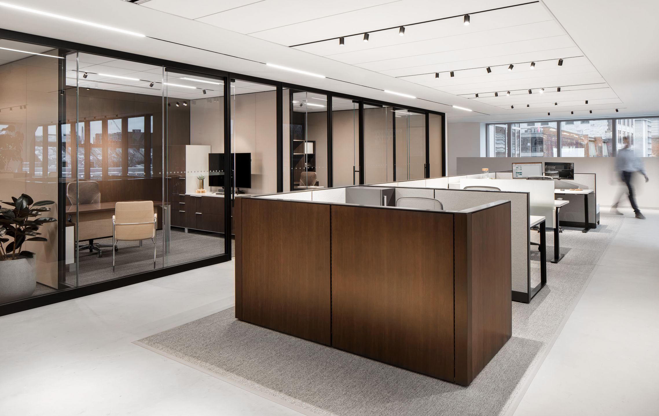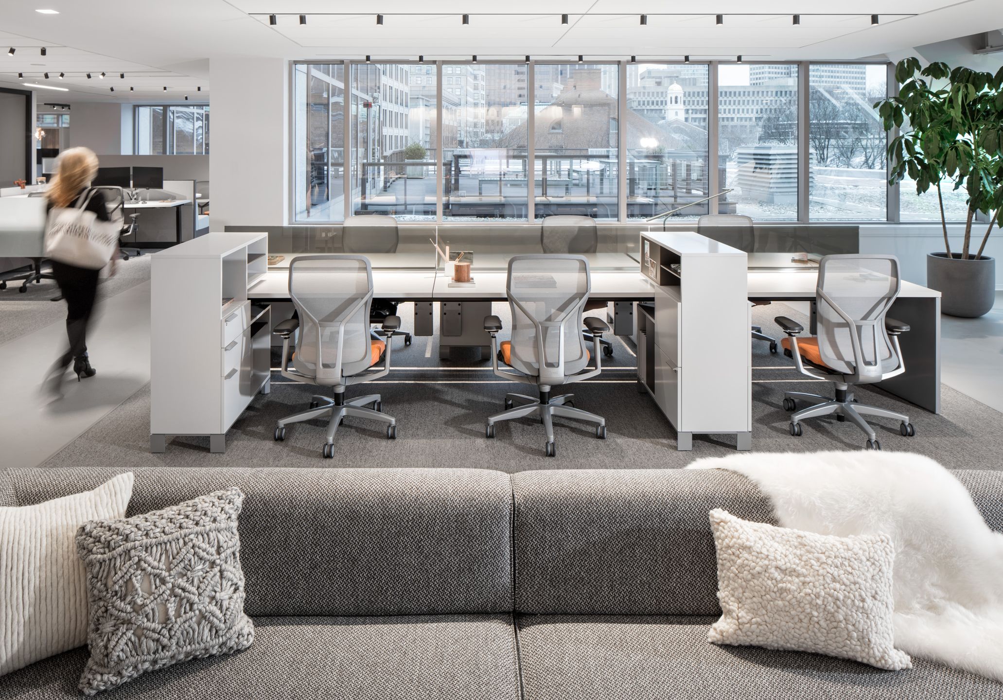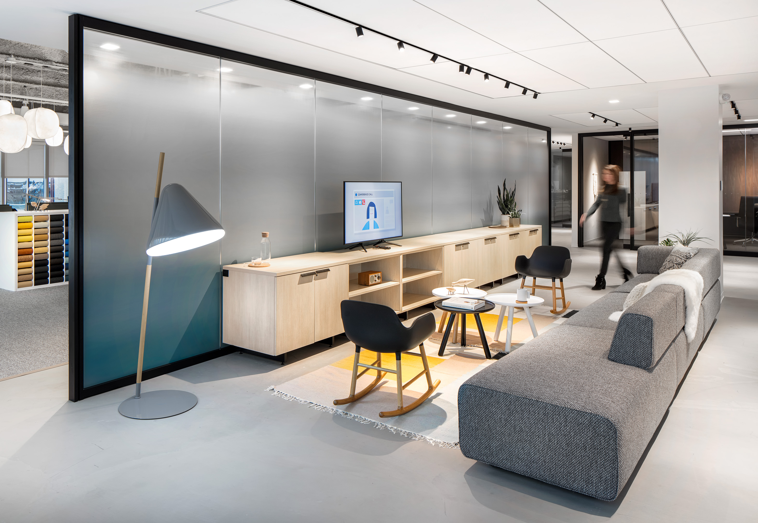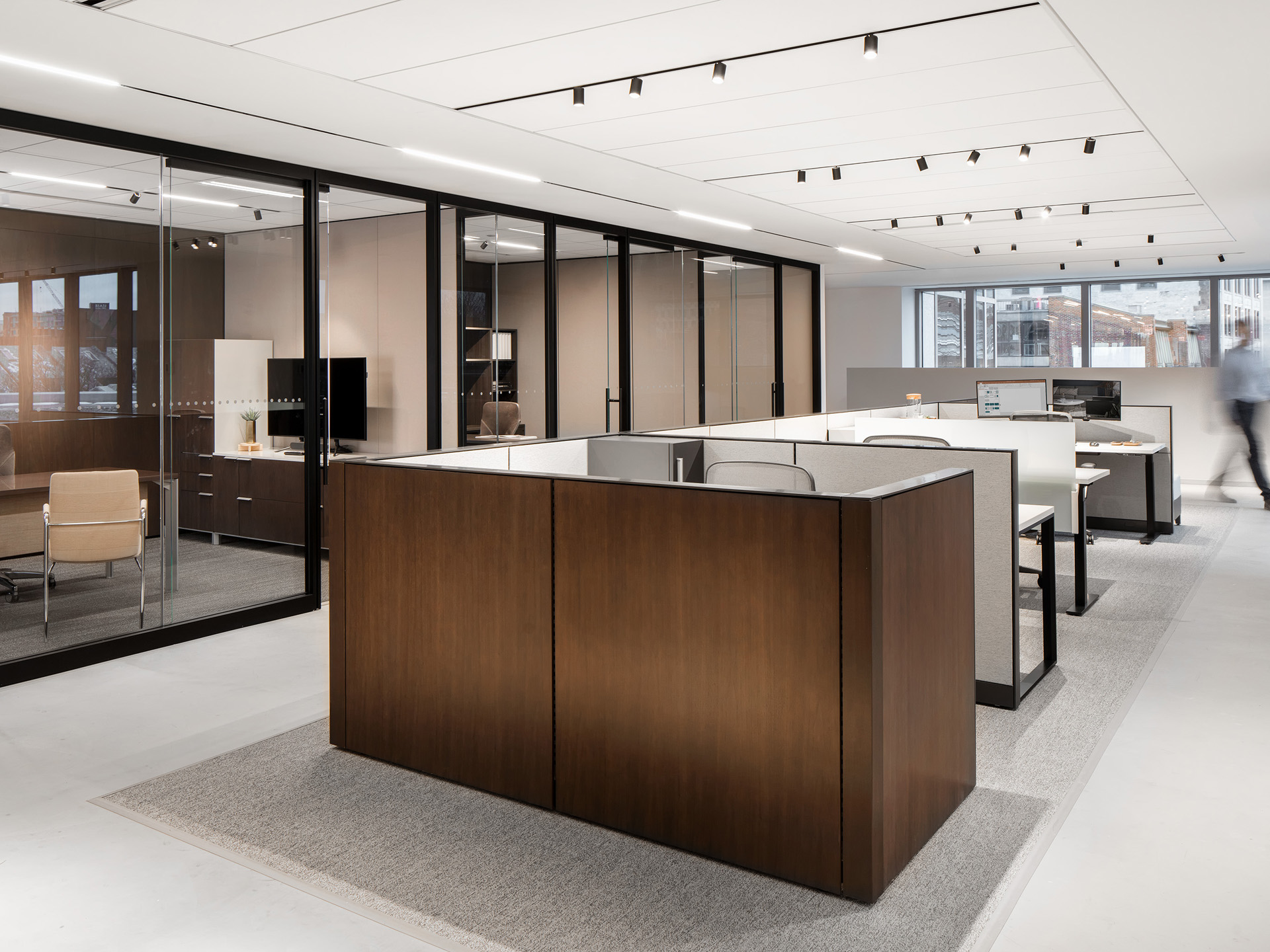 Allsteel Boston's showroom oversees the Boston harbor with long stretches of offices, hallways and panels to create a fluid pathway throughout the space. To illuminate these wide swatches, M-LINE spot lights are employed throughout the space. Groups of track lights decorate the ceiling with a smooth and consistent rhythm that excellently matches the aesthetics of AllSteel's industrial, yet professional environment.