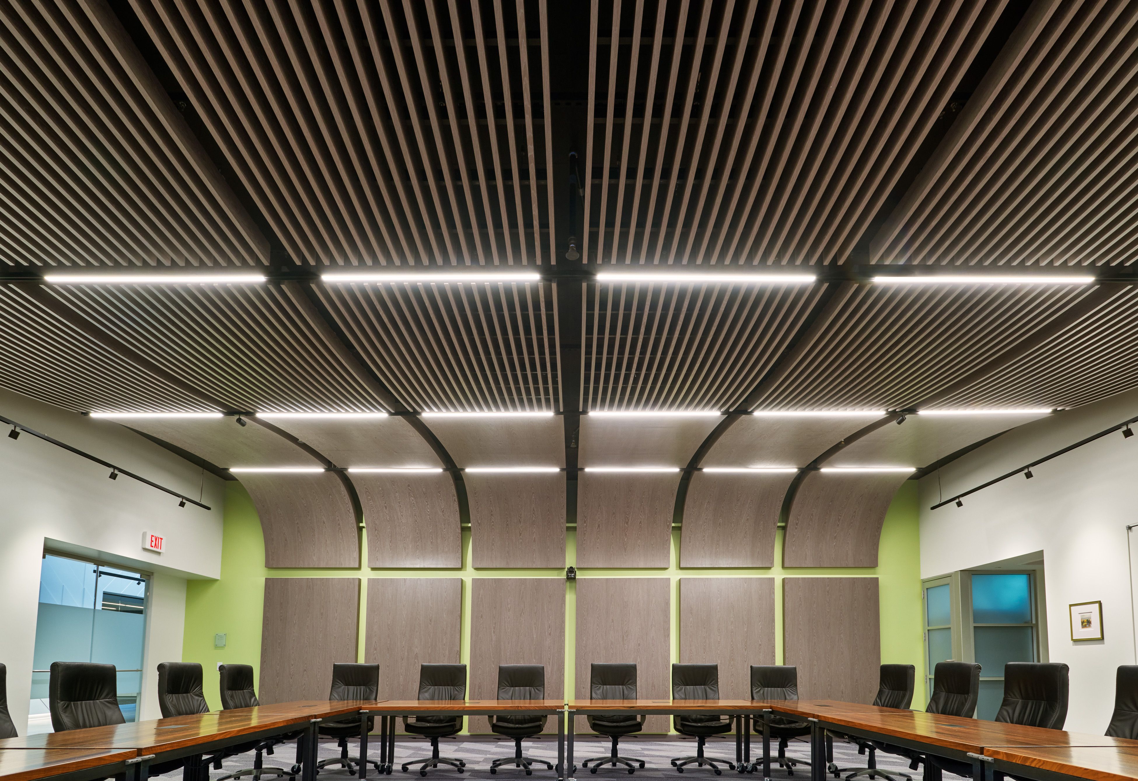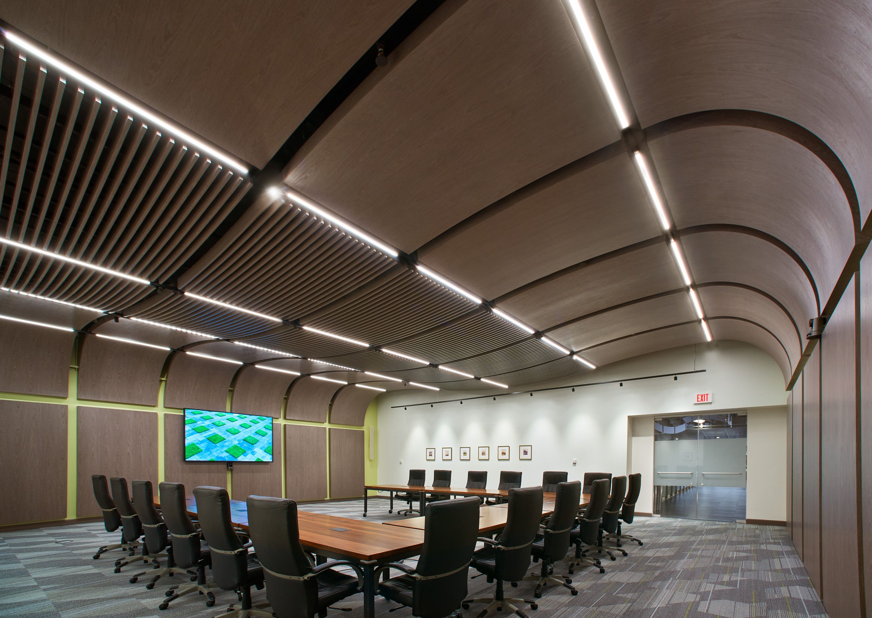 This presentation room found in Armstrong's Corporate headquarters has an acoustic interior with a consistent tempo throughout. M-LINE insets are used across the curved ceiling, punctuated with spotlights at certain intersections of the paneling. The lights run perpendicular to the grille panels and track lightings illuminate the walls, creating an ideal environment for conferences and lectures.