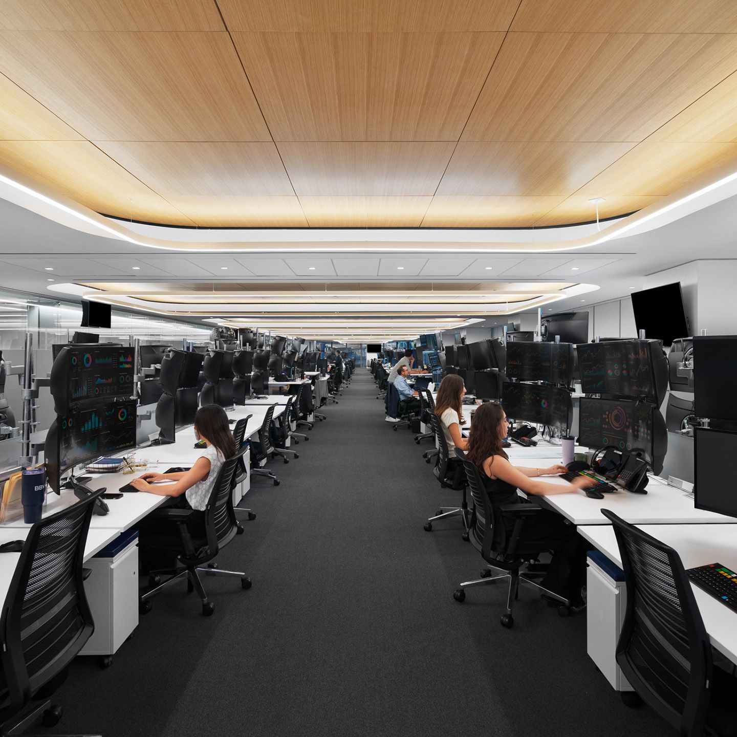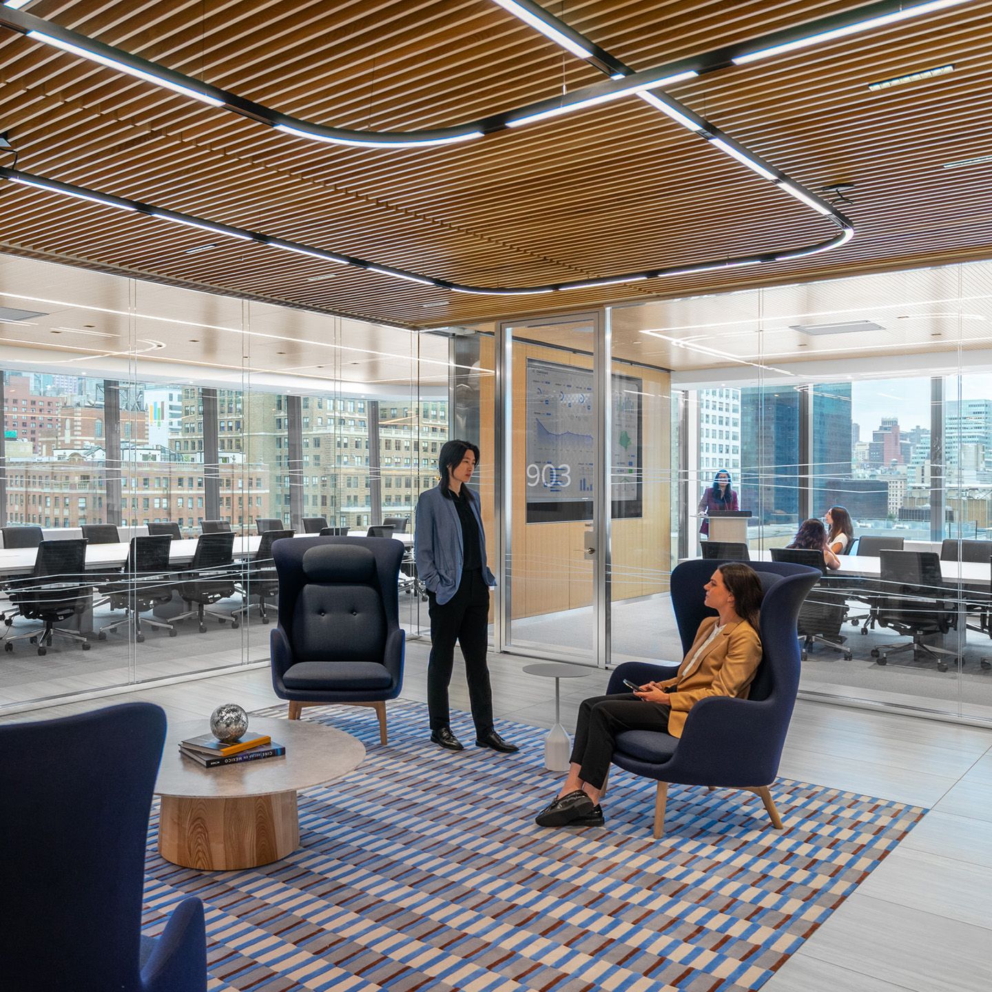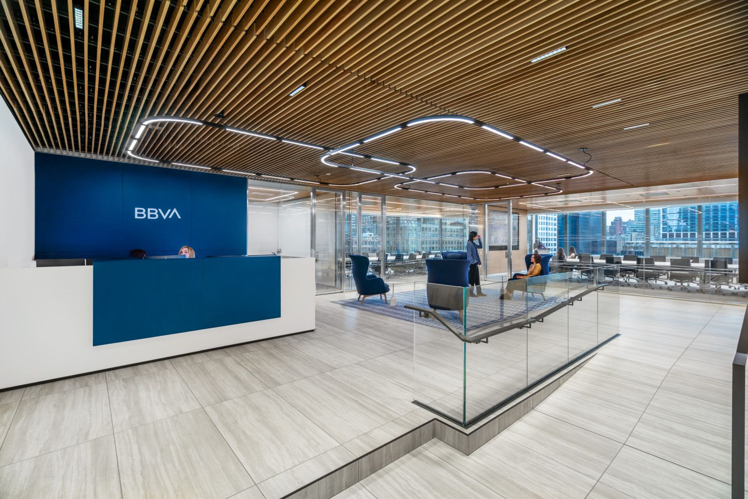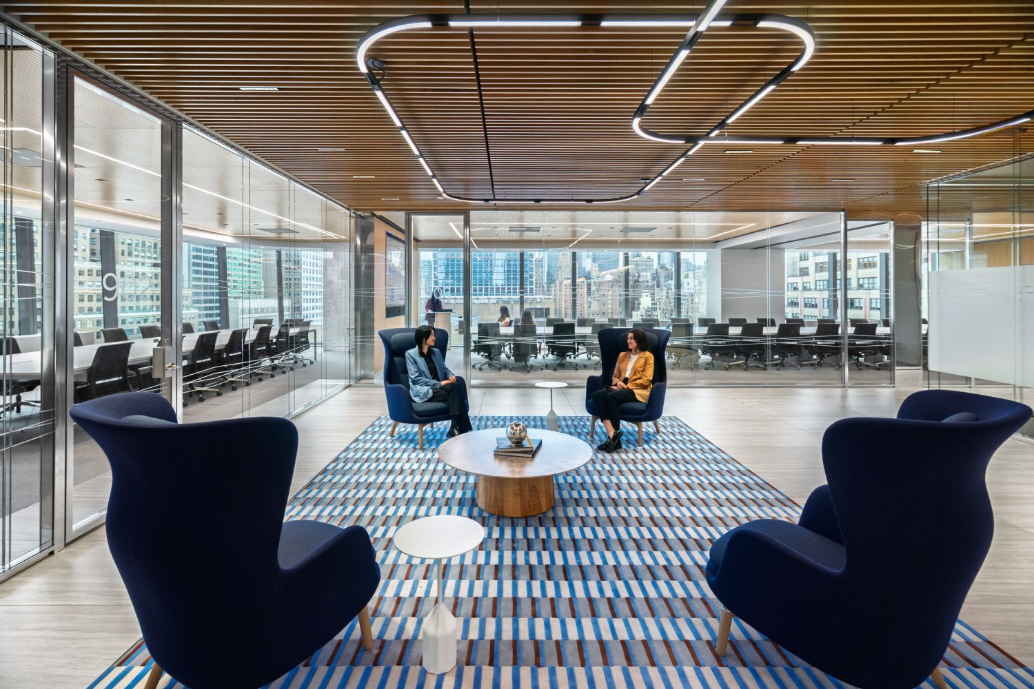 Located at Brookfield's Two Manhattan West, observing Hudson Yards from the eighth and ninth floor, BBVA (Banco Bilbao Vizcaya Argentaria) is one of the largest financial institutions in the Spanish market. An impressive and lucrative market portfolio requires a professional and streamlined office that prioritizes essential and sophisticated design elements.