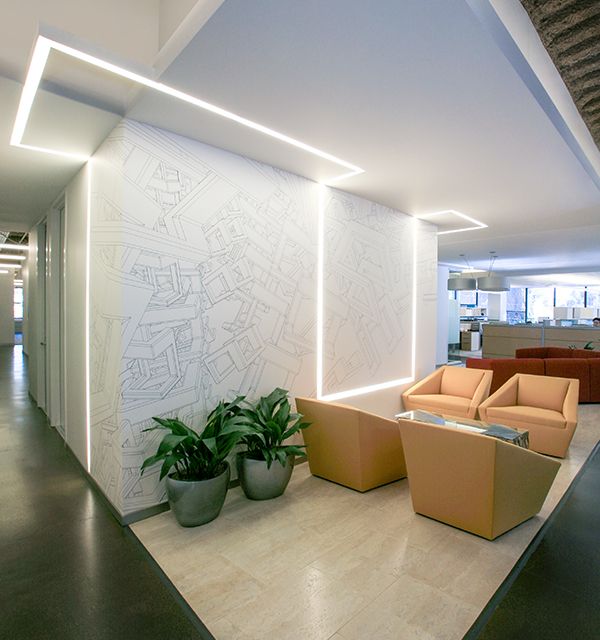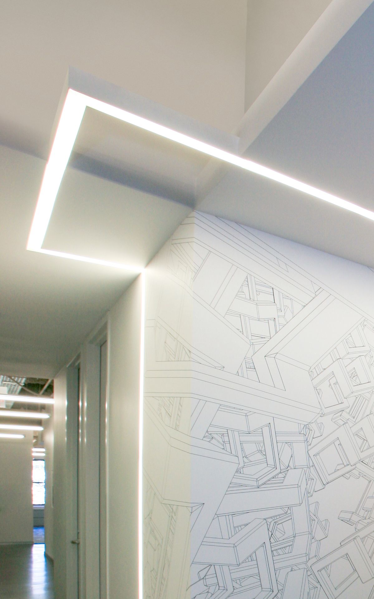 To stand out in Beverly Hill, California, Wolcott Interiors implemented BASO's unique verticality to create engaging lighting designs that communicate directly with their architecture. The offices and lobbies of the Real D have an exciting design fitting for the entertainment world.